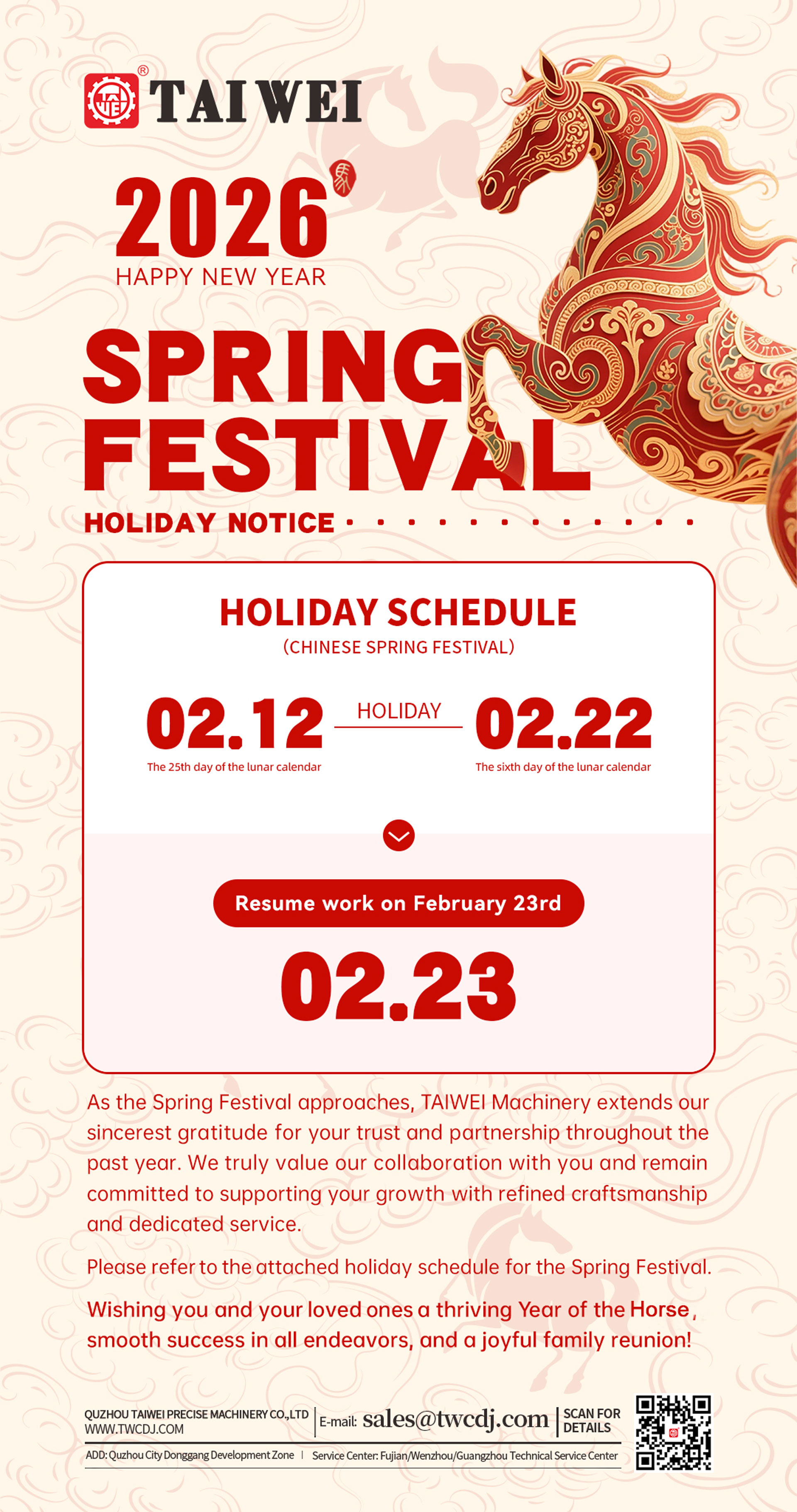 TAIWEI Machinery | Notice of Spring Festival Holiday in 2026!
